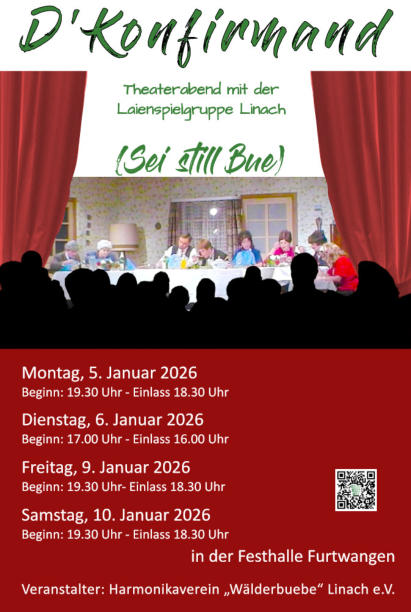 21.12.2025 Vorspielnachmittag 27.12.2025 Seniorennachmittag 28.12.2025 Kirche in Linach 05.01.2026 Theaterabend - ausverkauft 06.01.2026 Theaterabend- ausverkauft 09.01.2026 Theaterabend - ausverkauft 10.01.2026 Theaterabend - ausverkauft 13.02.2026 Fasnetfridig 07.03.2026 Generalversammlung 13.03.2026 Preiscego 28.03.2026 Jahreskonzert 10.04.2026 Nachtwanderung 03.07.2027 Freilichttheater 04.07.2027 Freilichttheater 16.07.2027 Freilichttheater 17.07.2027 Freilichttheater 23.07.2027 Freilichttheater